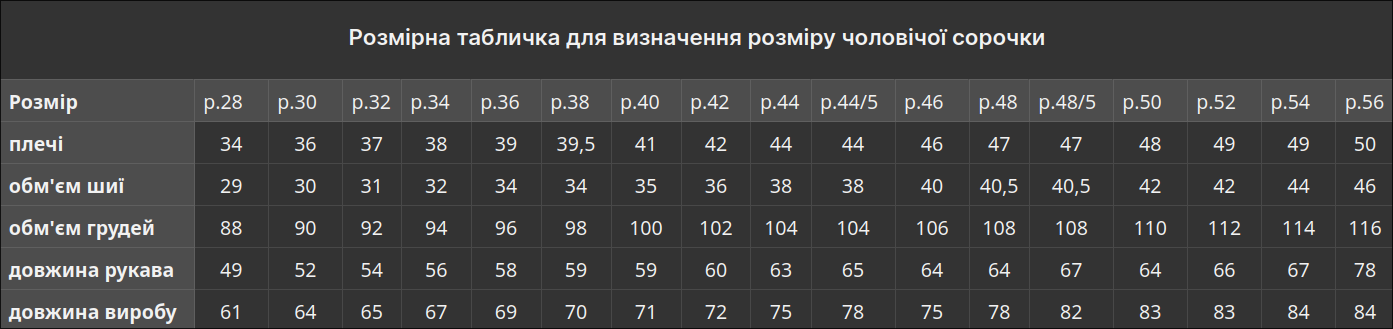 Для визначення розміру сорочки скористайтесь таблицею, що подана нижче.