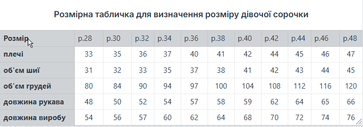 Для визначення розміру сорочки скористайтесь таблицею, що подана нижче.